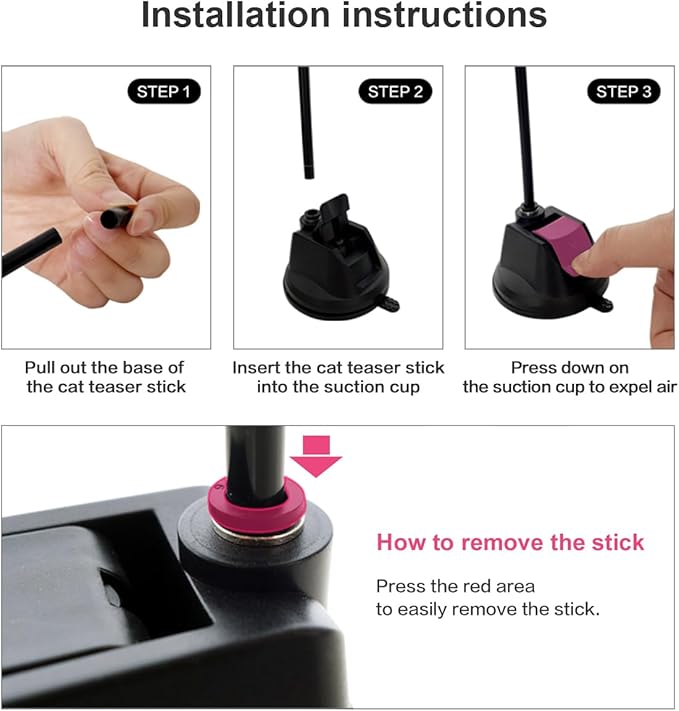 - 【Suction cup design】The suction cup is sticky tightly and easy to install on the smooth surface, such as window, marble, wooden floor, doors(Not stick to wall, carpet). It achieves automatically entertaining cats. This cat toy unlock two ways to tease cats: ① You can either hold the cat wand to interact with cats. ② when you’re tired or busy, insert the cat wand into suction cup, it will be a automatic cat wand toy.
