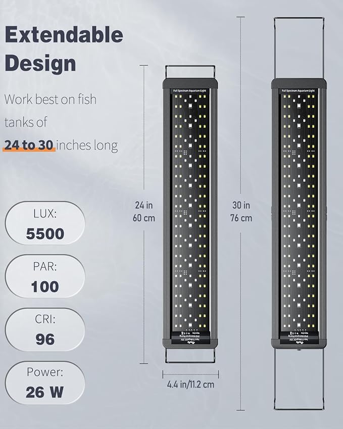 - For 24" to 30" Tanks: With an extendable bracket (min length: up to 24"; max length: up to 30"), the LED aquarium light always stays steady on the fish tank. Work best on tanks of 24 to 30 inches long.