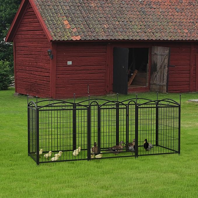 - 【Safe & Secure】: Featuring an automatic gravity-actioned locking system and stakes with round ball tips, the playpen keeps your pets safe and prevents them from rushing out, while also protecting you and your animals from injury.