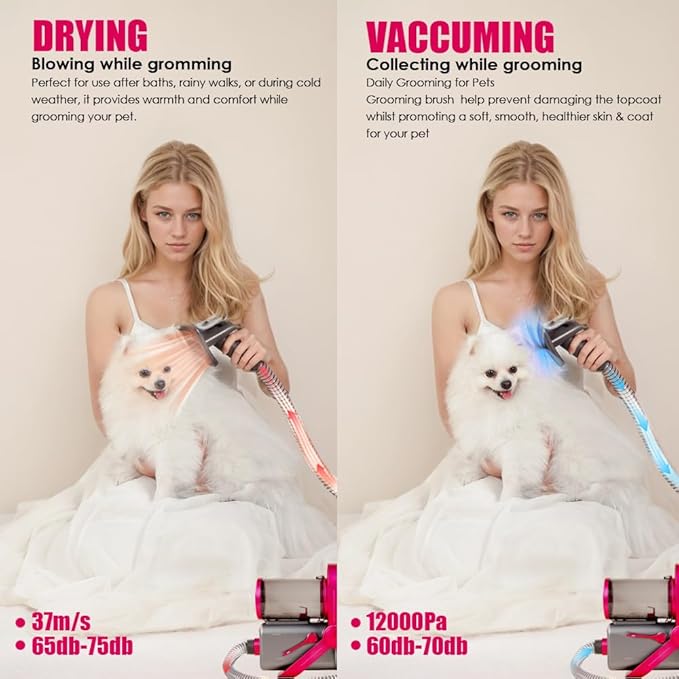 Dog Hair Vacuum / Blow Dryer One-Touch Switch, Dual-Motor Pet Grooming Kit For Shedding With Expandable Dust Cup, 8 Grooming Tools - Dog Vacuum Clipper Trimmer Nail Grinder Slicker Brush (Rose Red)