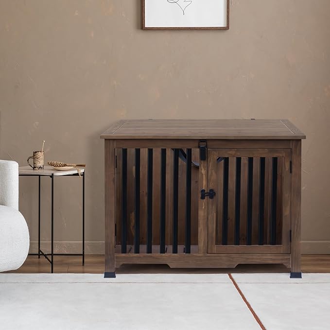 - Solid Wood Dog Crate:Made of high quality solid wood and thickened iron pipe,the large dog crate furniture is sturdy and chewable,providing health protection for your dog.The top of the dog crate table holds pet supplies and other decors.