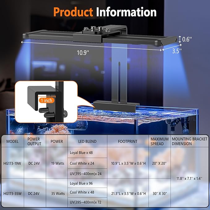 - 2 Mounting Solutions -- hygger Marine ONE coral light is designed to 2 mounting solution for your set up, a sturdy aluminum mounting bracket supports up to 1 inches thick framed or frameless tank and two mounting legs extend up to 4.5 inches on either side of the fixture