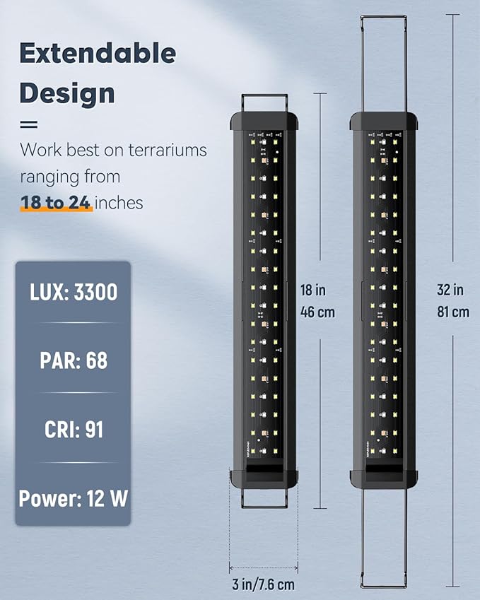 - For 18" to 24" Terrariums: With an extendable bracket (min length: up to 18"; max length: up to 32"), the reptile LED light always stays steady on the tank. Work best on reptile tanks of 18 to 24 inches long