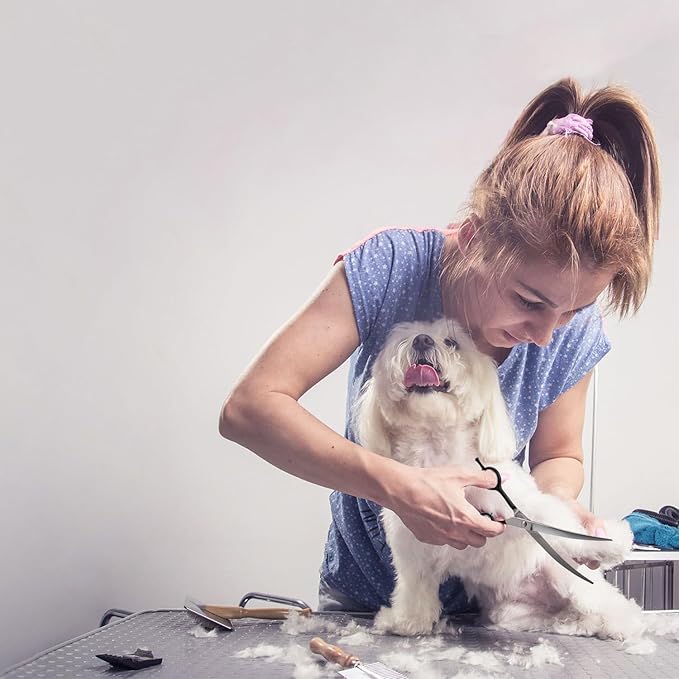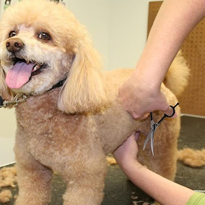 - MULTIFUNCTIONAL – Measuring 7 inches with 3.38-inch blades, these professional curved grooming scissors are ideal for use in pet hospitals, salons, and at home. They’re suitable for grooming sensitive areas such as eyes, face, ears, paws, and head, making them a versatile tool for both dogs and cats.