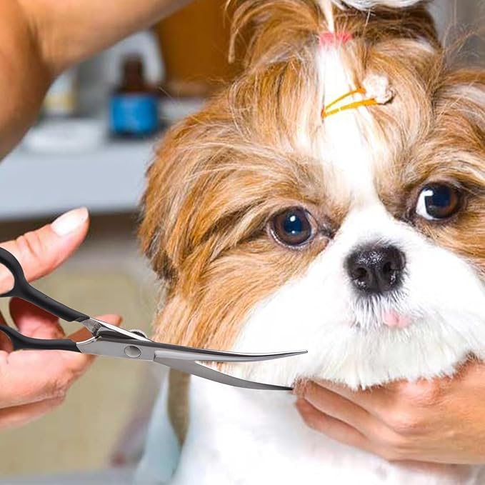 - MULTIFUNCTIONAL – Measuring 6 inches with 2.5-inch blades, these professional curved grooming scissors are ideal for use in pet hospitals, salons, and at home. They’re suitable for grooming sensitive areas such as eyes, face, ears, paws, and head, making them a versatile tool for both dogs and cats.