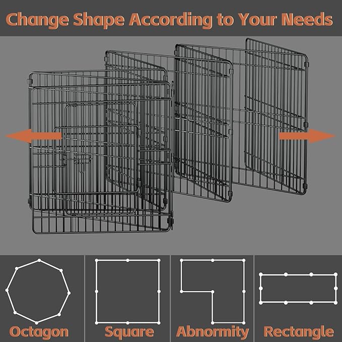 - 【8-Panel Dog Playpen for Flexible Setup】Easily configure this 24" dog playpen into square, rectangle, or octagon shapes with 8 detachable panels. Whether used indoors or outdoors, it offers a secure, spacious area for your pets to play, rest, or train—perfect for any home layout or yard space.