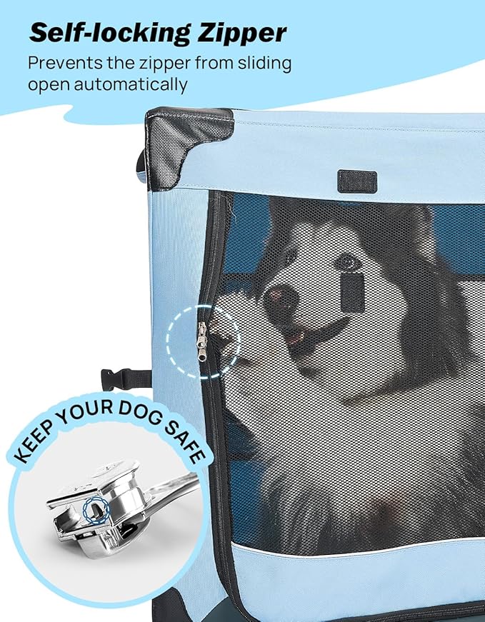 - _eep Safety: This collapsible pet crate uses a fully structural fixed steel frame that can bear a load of 50 lbs (Fit for pets up to 55 lbs), which can maintain its shape and ensure durability. The crate has a built-in traction rope to enhance your pet's safety. The included straps can be tied to the back of the car's rear seat to secure the crate. An anti-skid pad on the corner prevents the crate from sliding in the car. The zipper pull has built-in anti-slip teeth, so the zipper stays in place and won't be opened by your pet's claws. Let you and your dog travel worry-free