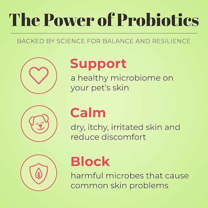 - Probiotic Formula- Each bottle contains topical probiotics that help support a healthy microbiome to defend against common skin problems such as itching, odor, dryness, dandruff, hot spots, and excessive shedding.