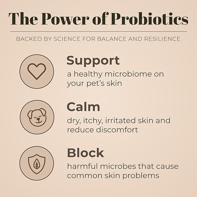 - Probiotic Formula- Each bottle contains topical probiotics that help support a healthy microbiome to defend against common skin problems such as itching, odor, dryness, dandruff, hot spots, and excessive shedding.