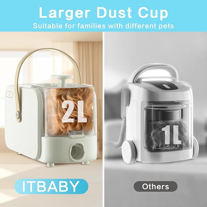 - 【2L Pet Grooming Vacuum for Dogs】ITBABY comes equipped with a spacious 2L dust cup, ideal for grooming two large dogs at once and own double capacily of simlar products, The hair colection unit opens effortlessly for contactless cleaning, minimizing the need for extensive maintenance