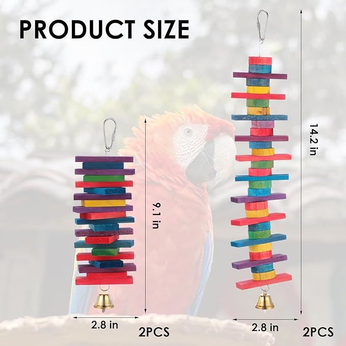 4 Pcs Parrot Toys, Birds Toys with Multicolored Natural Wood Blocks, Bird Chew Toys with Hook and Bell, Bird Cage Toys for Conures, Parakeets, Cockatiels, Lovebirds, African Grey Macaws, 2 Designs