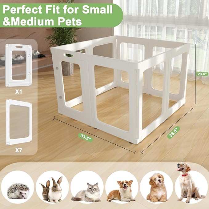 - 【Tool-Free for Assembling Dog Pens Indoor】Interlocking panels of small animal playpen snap together by hand—no screws or tools needed. Includes non-slip silicone feet for hardwood/tile floors and outdoor grass stability. Our clear dog play pen fits for kitty, rabbit, bunny, puppy, ferret, small animals