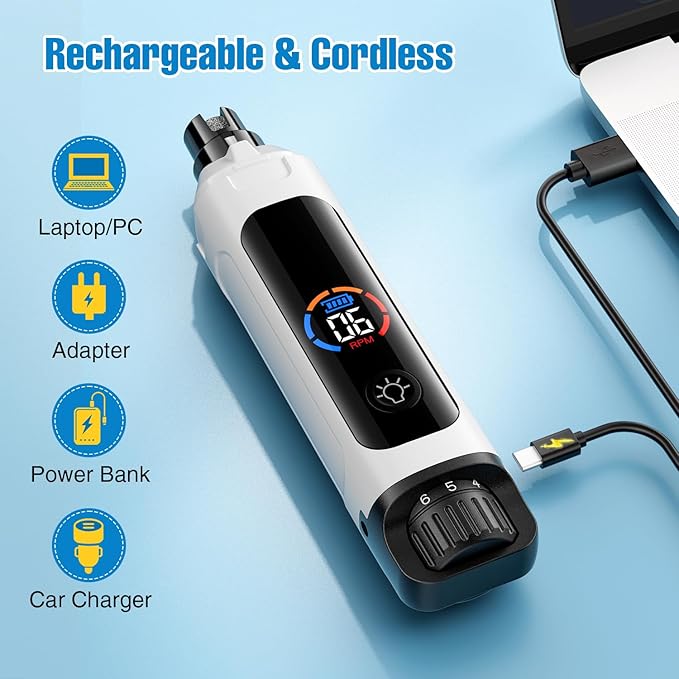 - LED Display Screen: Unlike traditional nail grinders, ours is designed with a digital display, allowing you to monitor the speed level and battery life easily. A dual LED light design allows your pet's blood vessels to be easily found and avoids over-grinding.