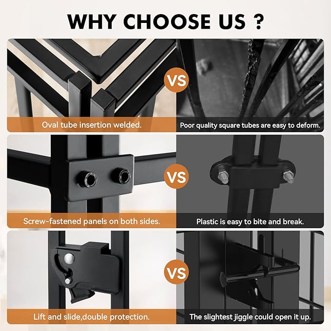 - ESCAPE-PROOF SECURITY WITH REINFORCED PROTECTION:Our dog crate features newly upgraded door locks and panel connectors. The innovative lift-and-slide unlocking mechanism provides dual-layer protection, effectively preventing pet escapes. Reinforced screw-fastened side panels ensure enhanced sturdiness and stability, maximizing your pet's safety.