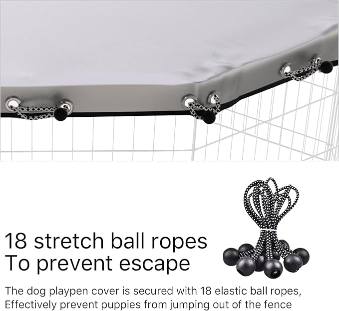 - _revents Escape_he protective net is tightly secured with 18pcs elastic ball rope, creating a narrow gap between fasteners. This design effectively prevents puppies from jumping out of the pen, ensuring they remain securely enclosed