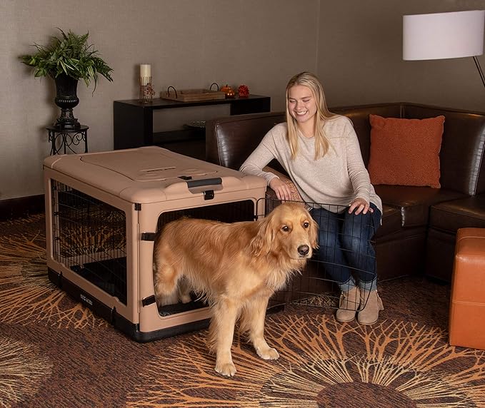 Pet Gear _he Other Door 4 Door Steel Crate for Dogs/Cats with Garage-Style Door, Includes Plush Bed + Travel Bag, No Tools Required, Beige
