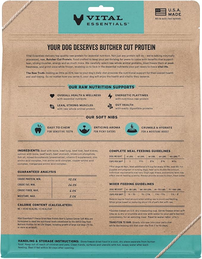 - SOFT NIBS FREEZE-DRIED RAW BEEF & SALMON DOG FOOD: Vital Essentials Freeze Dried Soft Nibs Dog Food packs more protein than industry standard into every soft bite to deliver the peak vitality your dog deserves, especially when compared to dehydrated dog food. This complete and balanced freeze-dried raw dog food is made with premium Butcher Cut beef and salmon, responsibly sourced in the USA.
