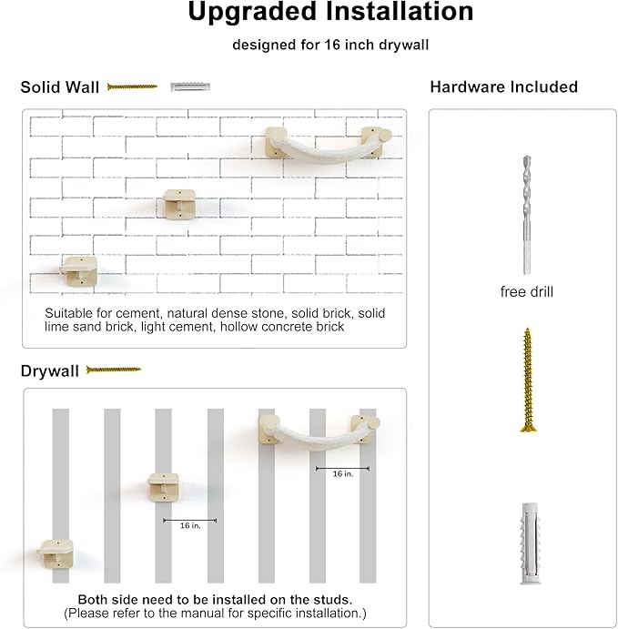 - Easy Installation - Compatible with 16 inch stud spacing, suitable for drywall and solid walls. The cat wall climber includes all necessary hardware and detailed instructions.