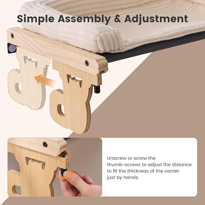- 【Slide. Screw. Done! Installs Faster&Flexible Adjustment】Our cat window seat just require simple assembly. Step 1-Secure the main frame. Step 2-Adjust the hook-to-bracket gap to fit your windowsill. Step 3-Rotate to lock – done! No tools, no hassle. Enjoy LEGO-like simplicity in 3 steps!