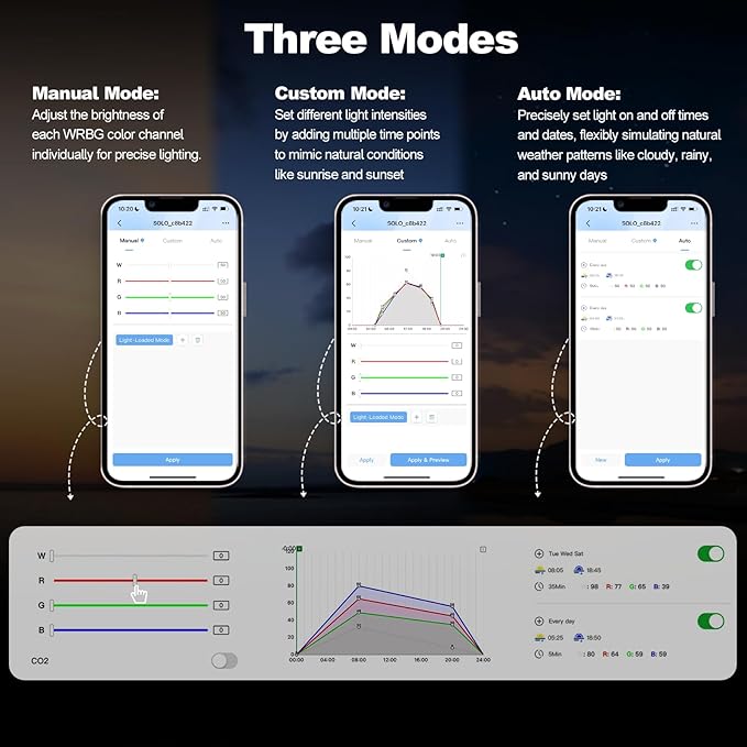 - Manual/Auto/Custom 3 Modes: The aquarium light offers Custom Mode, allowing you to set up to 24 time points for a personalized sunrise and sunset cycle. Auto Mode lets you schedule light simulate dynamic weather conditions such as cloudy, rainy, or sunny days, creating a natural environment in your tank. Manual Mode provides precise brightness and color adjustments