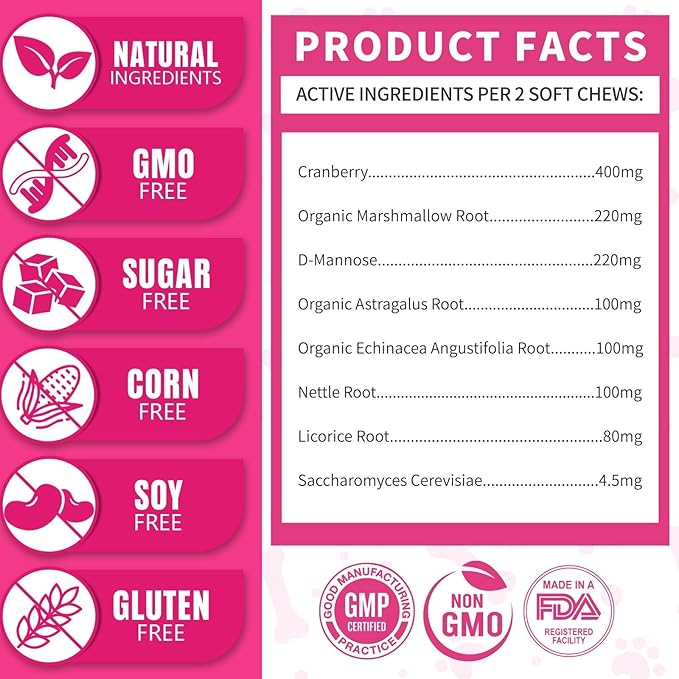 - Natural Gentle Formula: Made with natural ingredients like cranberry, D-mannose, and organic Echinacea root. Gentle yet effective, this urinary tract supplement provides essential support for your dog’s urinary system and kidneys, promoting normal urinary function and helping them enjoy a healthier, happier life.