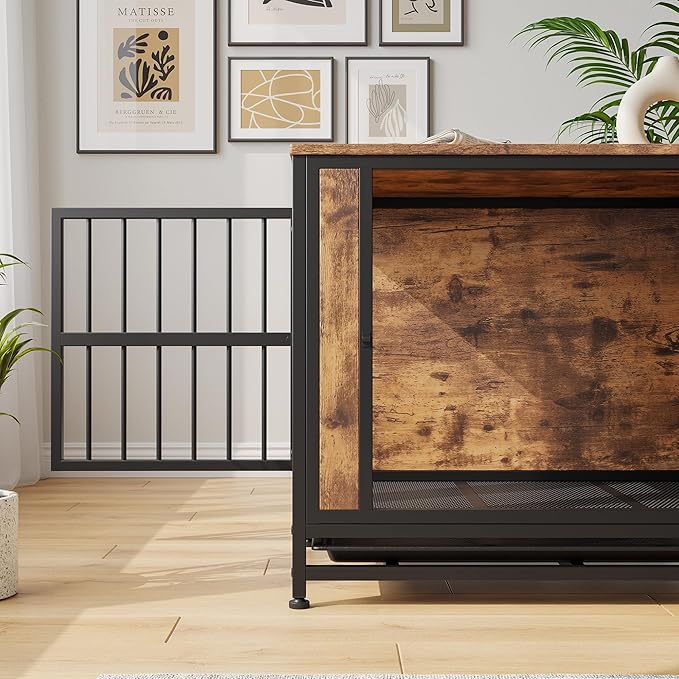 - Versatile 3-in-1 Design:This dog crate serves as a safe haven for your pet, a stylish side table, and a functional nightstand. Its elegant rustic brown finish blends seamlessly with your home decor, elevating any space