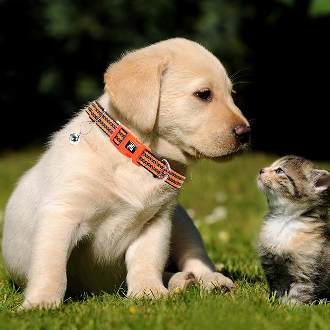 Adjustable Reflective XS/XXS Dog Collar with Bell - Nylon Puppy Collar for Chihuahua, Pomeranian, Small Dogs, Nighttime Safety, Orange XS