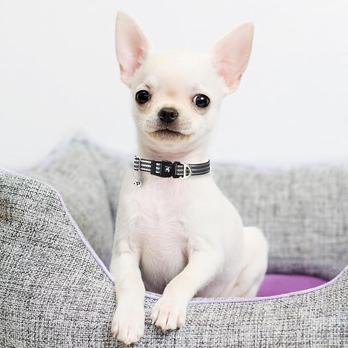 Reflective Dog and Cat Collar with Bell - Hypoallergenic Adjustable Puppy Collar for Small Pets, Soft Nylon Night Safety with Reflective Strips (Silver, XS)