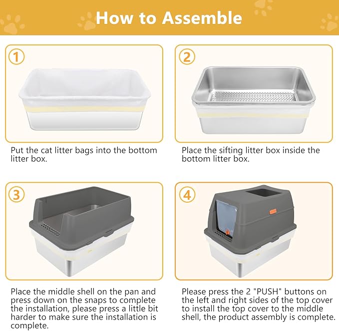 - 【Premium Stainless Steel & Odor Control】The stainless steel cat litter box is made of high-quality materials,built to withstand up to 5 years of use without losing its shape.The litter box pan is made of stainless steel, making clean a breeze compared to plastic litter boxes. Metal litter boxes do not retain odors or stick to waste, and boasts excellent durability, scratch resistance, odor resistance, stain resistance, and rust prevention.Beside,It also features a deodorizing compartment for placing bamboo charcoal bags to absorb smells quickly.