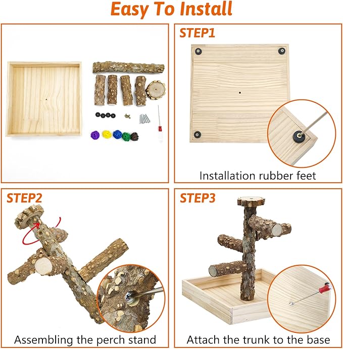 - Easy To Install & Clean: Quick assembly with mini hex key connects perch to tray. Effortless disassembly enables easy cleaning. Bird play stand perfect for indoor areas, keeping your space tidy while enjoying time with your feathered friend