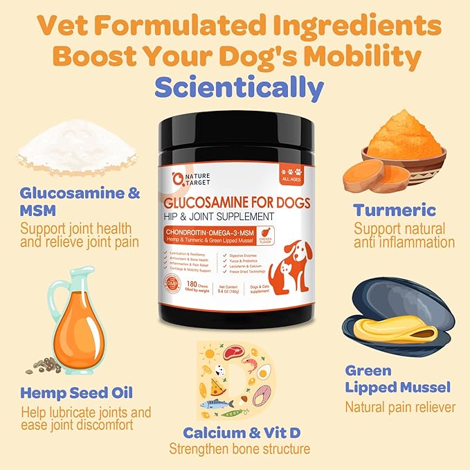 NATURE TARGET Glucosamine for Dogs - Hip and Joint Supplement for Dogs, 180 Crunchy Chews, Glucosamine Chondroitin, Omega-3, MSM, Turmeric for Pain Relief, Dog Joint Supplement Large & Small Breed