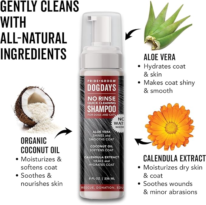 - Effortless Waterless Cleaning – Keep your pet fresh and clean without the hassle of a full bath. Pride and Groom DogDays No Rinse Quick Cleaning Shampoo is a quick, foaming cleanser that removes dirt, dander, and odors while leaving your pet’s coat soft and refreshed. Perfect for busy pet parents, travel, or post-adventure cleanups.