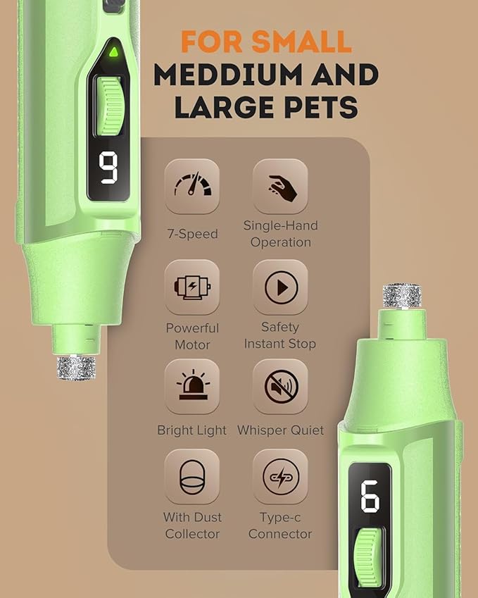 - 7 SPEEDS ADJUSTABLE: Ranging from 8,000 to 15,000 RPM, as one of the most powerful grinders, ideal for trimming the nails of small, medium, and large dogs, cats, birds, and other small animals