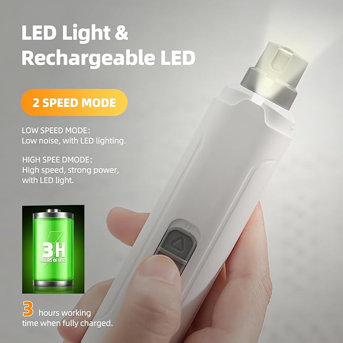 - [USB charging and portability]:The cordless pet nail sharpener is rechargeable and has an indicator light on the bottom that lights up when charging. Each pet nail clipper has a built-in 400mAh high-capacity battery that can work up to 3 hours after fully charged, ensuring uninterrupted dog or cat nail care. The lightweight and ergonomic body design also makes it easier to operate in your right or left hand.