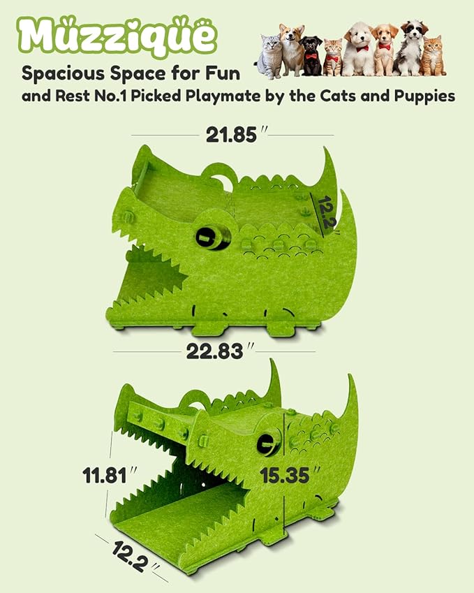 Cat House, Muzzique Cute Crocodile Felt Pet Nest, for Indoor Cats & Small Dogs, Removable Washable Kitten Playhouse, Large Peekaboo Kitty Cave, Enclosed Puppy Bed, Scratch/Sleep Dog Cube Furniture