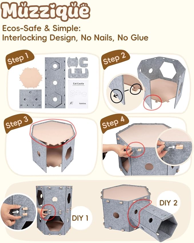 - [TOOL-FREE EASY ASSEMBLY] Our pet cube utilizes traditional mortise-and-tenon joinery, eliminating the need for nails or no harmful adhesives. Designed for quick setup by a single person, the interlocking felt panels create a sturdy perch. The precision-engineered hexagonal structure is strong enough to support 45 lbs, making it a safe choice for large cats.