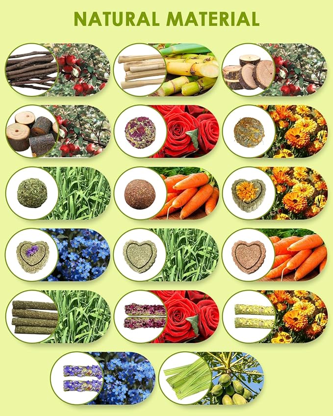 - 【List of Packages for Rabbit Enrichment Toys】 Apple branch*6 (100g approx.), Sweet bamboo *5 (100g approx.), Apple wood slices*5 (diameter 3.5-4.5cm), Apple wood small pieces*5 (diameter 1.5-2cm), Rose grass ball *2, Marigold Grass Balls*2, Flowerless grass ball *2, Carrot Grass Balls *2, Marigold Grass Cake *3, Forget-me-not Cake*3, Flowerless grass cake *3, Carrot Grass Cake *3, Grass Stick Flowerless*4, Rose straw *2, Chrysanthemum Straw Cake *2, Forget-me-not straw *2, Hook *4, Papaya stems (10 stems), Transparent box *1, Sisal rope 100cm*2