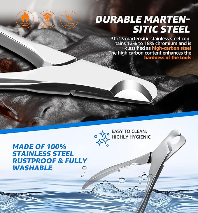 - Premium All-Steel Construction: Crafted from high-quality martensitic stainless steel, these nail clippers deliver exceptional durability, rust resistance, and a sharp, long-lasting edge. The heavy-duty build ensures clean cuts every time, making it a reliable grooming tool for years to come.