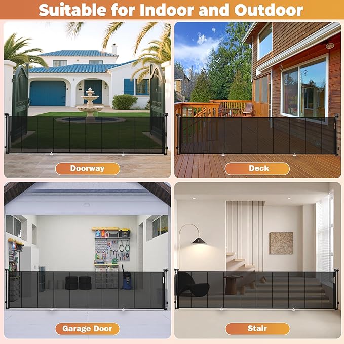 - 【Versatile for Indoor and Outdoor Use】This retractable dog gate is designed to meet your needs both indoors and outdoors. It can be installed in living rooms, kitchens, stairways, and other interior areas, as well as in hallways, garages, patios, pools, backyards, and other outdoor spaces. Keep your little ones and pets safe from hazardous areas with this reliable solution!