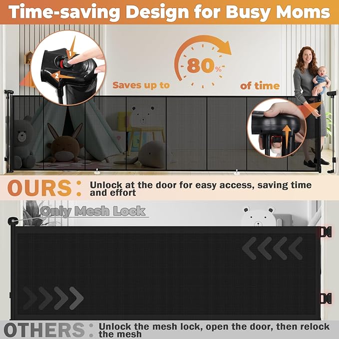 - 【Convenient Lock Design for Busy Moms】This retractable mesh gate features a unique design with separate mesh and door locks, allowing you to easily open and close the gate at the entrance without having to unlock the mesh first. Unlike other retractable baby gates that require you to unlock the mesh before opening the door and relock it afterward, our gate saves valuable time for busy moms! Additionally, the one-touch unlock design of the mesh lock lets you easily lock and unlock with just a fingertip. These thoughtful features are perfect for moms on the go!