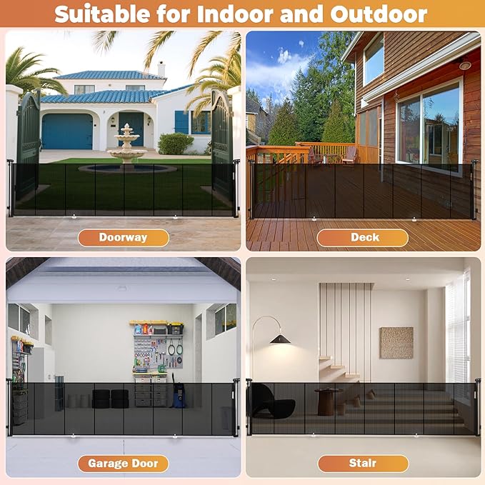 - 【Versatile for Indoor and Outdoor Use】This retractable dog gate is designed to meet your needs both indoors and outdoors. It can be installed in living rooms, kitchens, stairways, and other interior areas, as well as in hallways, garages, patios, pools, backyards, and other outdoor spaces. Keep your little ones and pets safe from hazardous areas with this reliable solution!