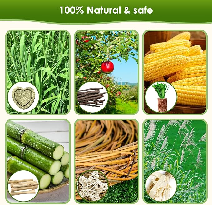 - ✅ NATURAL & SAFE MATERIALS: The RABBIT ENRICHMENT TOYS made of 100% natural reed grass, corn, timothy hay, apple wood , sweet bamboo and Papaya Stems, chemical free and safe to chew. Not all forage contains digestive enzymes! The natural papain in papaya stems acts like a "gut guardian," helping rabbits eliminate hairball risks.