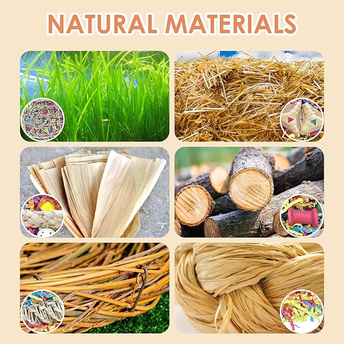 - NATURAL and SAFE MATERIAL : Recommended by Bird Behaviorists , Tyotrbs parrot toys are made of high quality seaweed hand-woven 24h as a base with 6 natural chewing elements (rattan ball, corn husk, corn cob, corn braid, lasso, loofah flakes, etc.), and many parrot owners give feedback of shinier feathers after using them