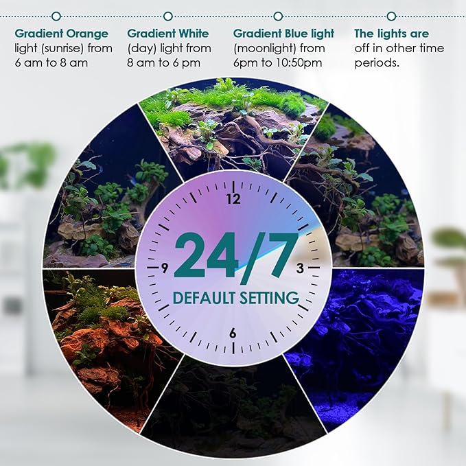 - DEFAULT MODE(24/7 Natural Mode): Gradient Orange light (sunrise) from 6 am to 8 am; Gradient White light from 8 am to 6 pm; Gradient Blue light (moonlight) from 6 pm to 10:50 pm; The 24/7 lighting aquarium lights are off in other time periods. The overall default time period can be delayed or advanced