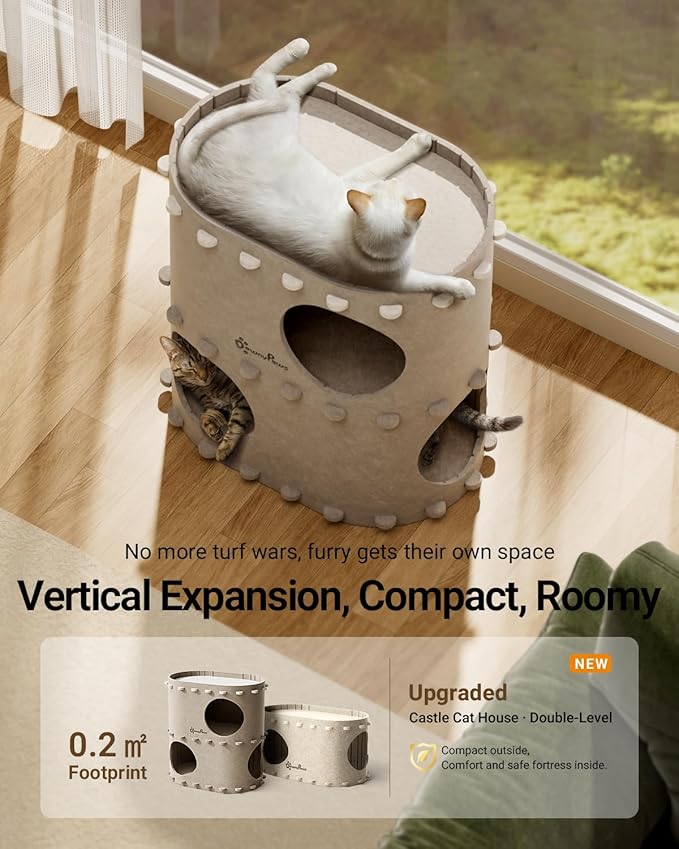- Peaceful Multi-Cat Haven: The double-layer design of our Castle cat house is comfortably hosts 3 cats simultaneously. Each fur baby enjoys private territory, eliminating territorial fights. Harmony for multi-cat households