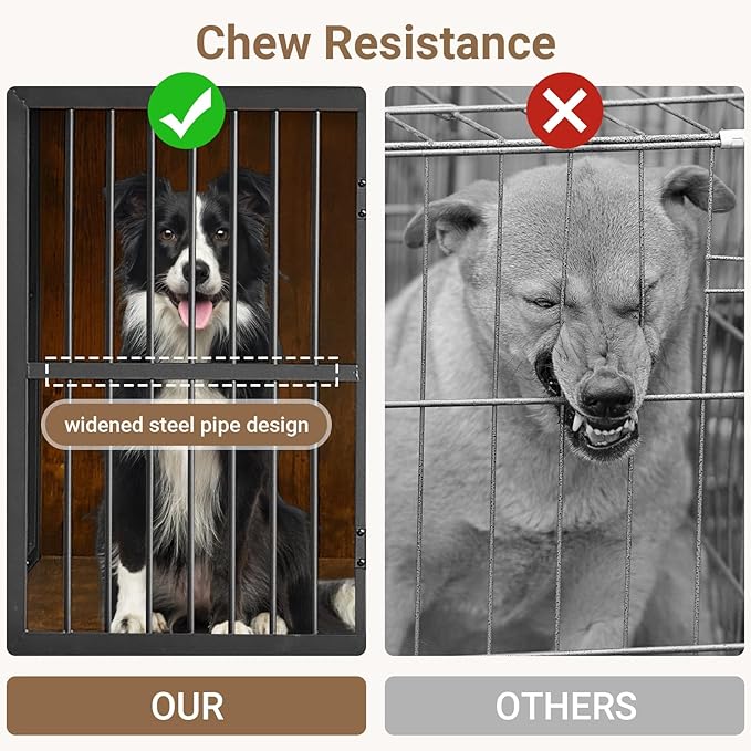 - Secure & Sturdy: Constructed with durable MDF panels and a reinforced iron frame, this indoor dog crate table offers solid support, holding over 400 lbs on top. The chew-resistant metal door frame and secure latches enhance safety while extending the crate’s lifespan.