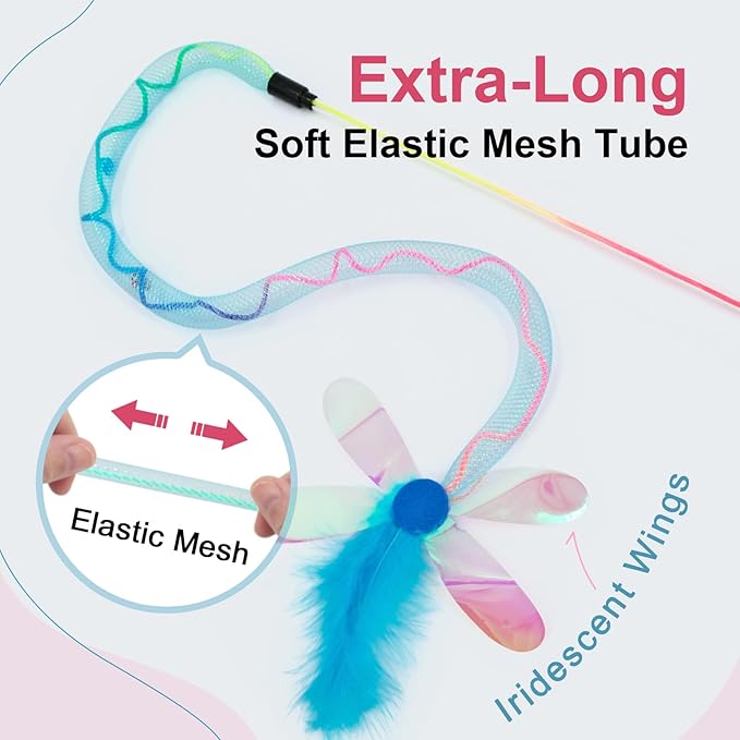 - Safe Material & Built for Wild Play - Our rainbow cat toys is tough yet gentle, our non-toxic nylon mesh and natural feather construction stands up to claws and bites, while the lightweight wand lets you guide the action effortlessly. No sharp edges-just happy, safe play!