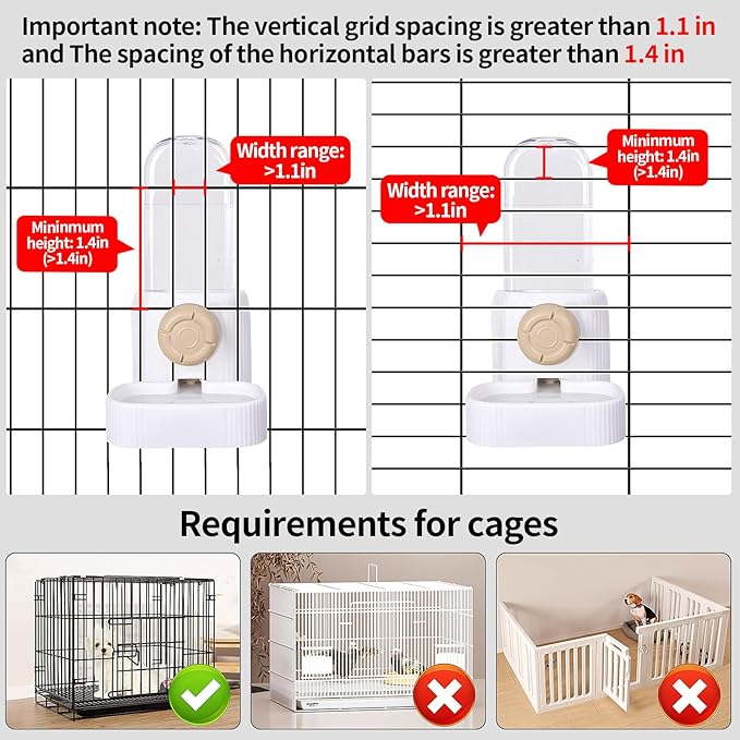 - Requirements for Pet Cages: The rabbit water bottle is suitable for metal wire pet cages and cage rods, with a width range of 1.1in. The height of the cage gap shall not be less than 1.4in. Please check out the pictures to confirm whether the cage is suitable