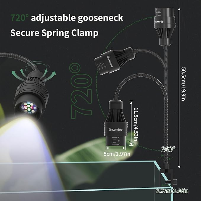 - 720º Flexible Positioning Gooseneck: The gooseneck of the LED fish tank light is made of high-quality silicone, which is stable and not easily deformed. The design allows for a 720-degree rotation, enabling easy adjustment of the aquarium light direction and angle