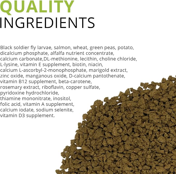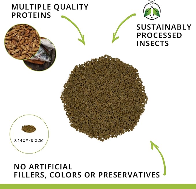 • Bottom feeder fish food that contains up to 40%, nutrient-rich Black Soldier Fly Larvae, the first ingredient